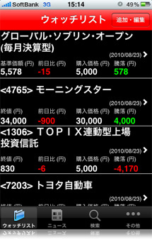この総合金融情報配信iPhoneアプリは、iPhone 携帯端末を通して、国内追加型公募株式投信約 3,000 銘柄、国内株式約 3,800 銘柄、国内上場投信(ETF)約 100 銘柄の情報等が閲覧でき、9月7日より提供を開始いたしました。