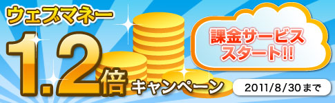 課金サービス開始に伴い、キャンペーン期間中にウェブマネーにて海神を購入されると、通常の1.2倍の海神がチャージされるお得なキャンペーンを実施いたします。