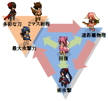 基本種属は左の図のように、近接系は遠距離系に、遠距離系は術系に、術系は近接系にそれぞれアドバンテージを持つ関係になっています。