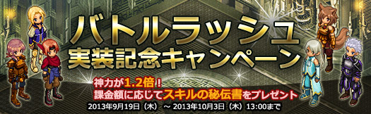 大型アップデートを記念して、全てのユーザー様に大変お得なキャンペーンを実施いたします。 その1.神力購入時の付与ポイントが1.2倍に! すべての決済方法において、神力を購入した場合、付与されるポイントがボーナスも含めて1.2倍となります。 その2.神力購入金額に応じてスキルを覚える秘伝書をプレゼント! キャンペーン期間中に購入した神力に応じて下記のスキルの秘伝書をプレゼントいたします。 ・1000神力以上課金したユーザーにヒールⅡの秘伝書 ・2000神力以上課金したユーザーにパーティーヒールⅡの秘伝書 ・3000神力以上課金したユーザーにオールヒールⅡの秘伝書 |