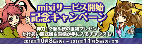 | 【キャンペーン詳細URL】 | キャンペーンの詳細につきましては、以下のリンクををご確認ください。 http://mixi.shikihime-garden.com/event/201310_mixi |