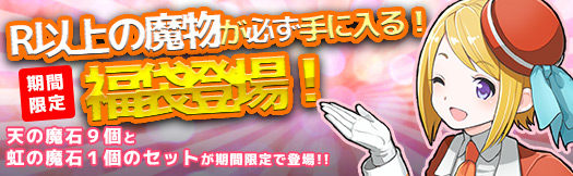 2013年12月25日(水)から2014年1月7日(火)までの約2週間限定で「福袋」の販売をいたします。「福袋」の中身は「天の魔石×9個」とR以上の魔物を必ず入手する事ができる「虹の魔石×1」のセ ットで、5,000神力で購入する事ができ、大変お得になっております!この機会に是非ご利用下さい。