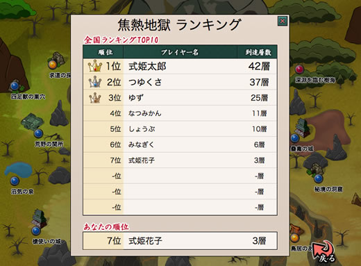 通常の討伐地とは異なり、期間でリセットされない無限地獄専用のランキングがあります。