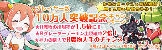 「アルフヘイムの魔物使い」において、プレイヤー数が10万人を突破した事を記念して、とって もお得な『プレイヤー数10万人突破記念キャンペーン』を実施します!