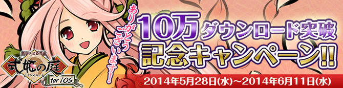 iOS版「式姫の庭」において、10万ダウンロード突破を記念して記念キャンペーンを実施します。