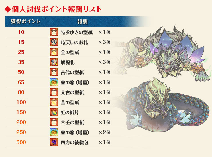 段階的に強さが用意された「四神」を討伐してポイントを溜めると、個人報酬が手に入ります。