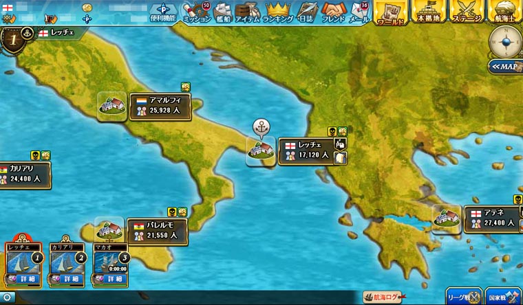 世界をめぐり交易品を売買することで資金を貯め、艦船の強化や街への投資を行う事ができます。また、交易路によって風向きが変化したり、全プレイヤーの取引量に連動して相場が変動するなど、非常に変化の富んだ貿易ができます。