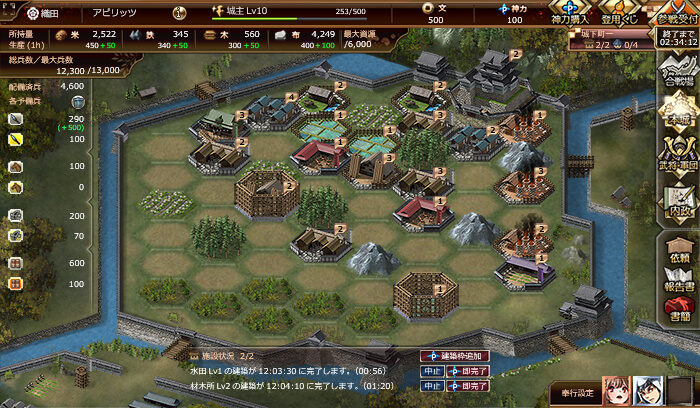 富国強兵のためには城下町の発展が不可欠。町を発展させて資源の生産、兵の強化を行い国力を充実させよう。