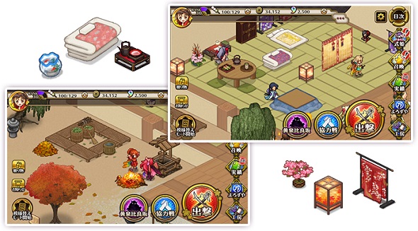 式姫たちが過ごす『自宅』では500アイテム以上の家具「置物」を配置して自分だけの住処を創ることができます。