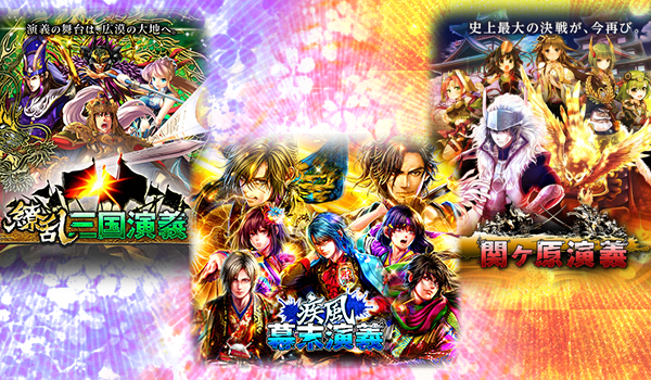 ゲームが苦手な人でも楽しめるシンプルなゲームシステムながら、他のユーザーと協力してゲームを攻略する奥の深いギルド要素を兼ね揃えたゲームです。現在、関ヶ原演義、繚乱三国演義、疾風幕末演義の3タイトルが展開されています。