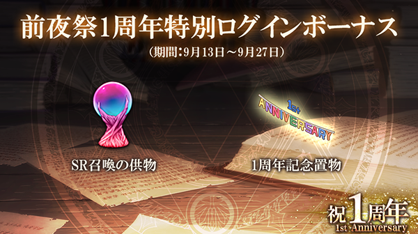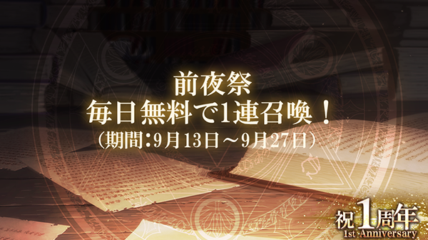 前夜祭を記念いたしまして、9月13日(金)より無料1連召喚を開催いたします。