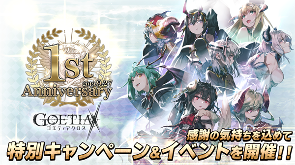 多くのユーザーの皆さまにプレイしていただき、『ゴエティアクロス』は2019年9月27日(金)で1周年を迎えます。