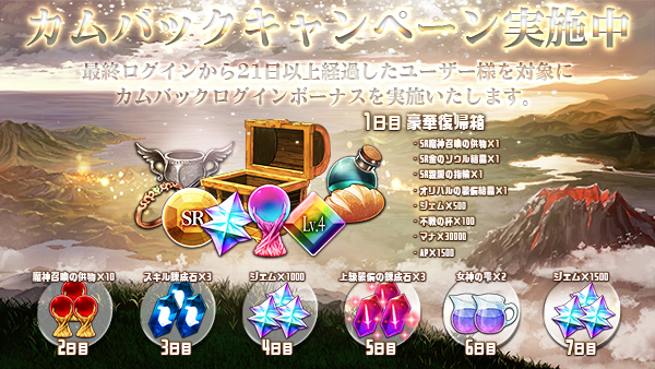 最終ログインから21日以上経過したユーザー様を対象に、カムバックログインボーナスを実施中です。