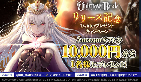 期間中にアンノウンブライド公式アカウント(@UB_staff)をフォローし、対象のツイートをリツイートした方から抽選で