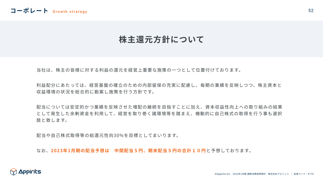 2022年1月期は業績予想を若干上回って着地いたしましたが、2023年1月期もWebソリューション事業は引き続き活況な市場環境を追い風に、DXを実現するパートナーとして⼤型かつ長期的な取引の獲得を継続し、安定した成長を見込みます。また、オンラインゲーム事業は、売上⾼成⻑を保守的に⾒込んでおりますが、外注費コントロール等でセグメント利益⽔準の引き上げを行い、全社として増収増益を目指します。