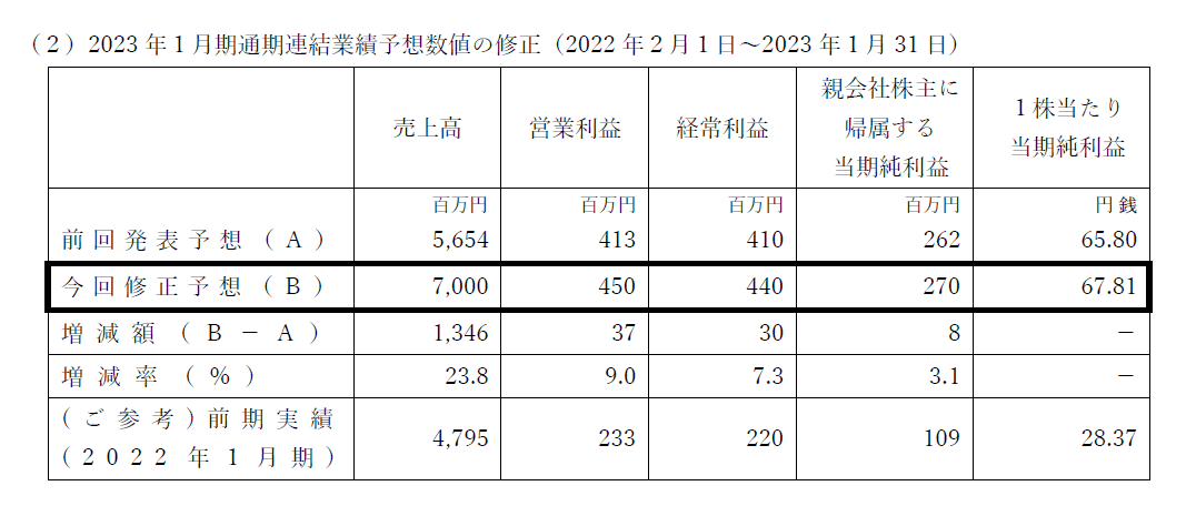2023年1月期 第2四半期累計期間及び通期業績予想の修正のお知らせ。