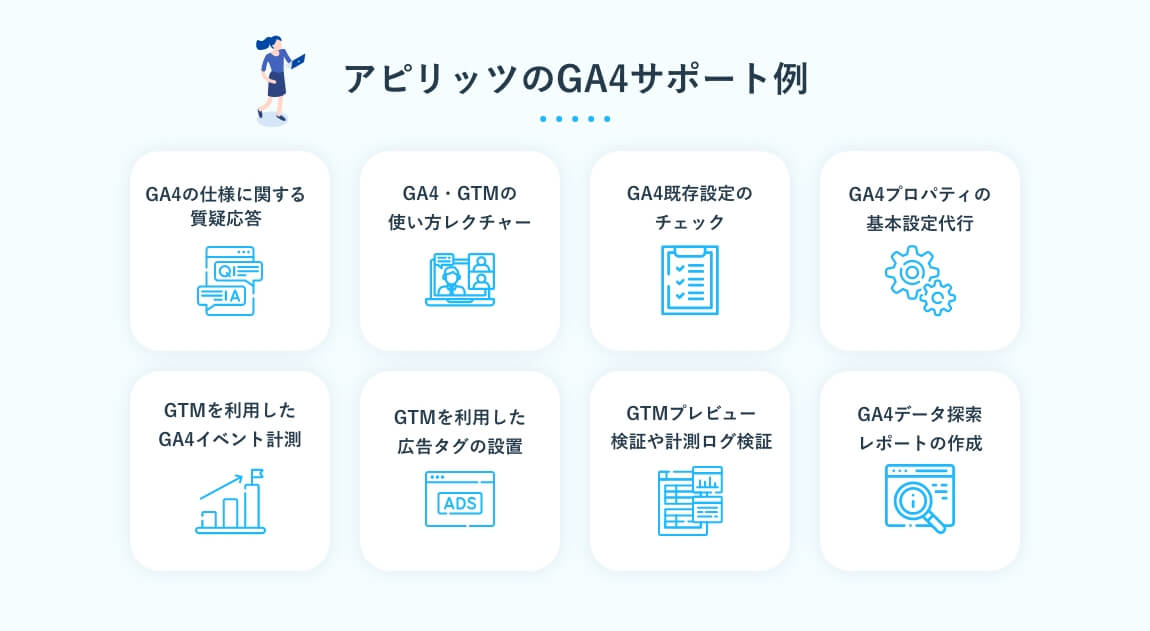 株式会社アピリッツ(本社:東京都渋谷区、代表取締役社長執行役員CEO:和田 順児)は、数多くの企業のGA4(Google アナリティクス 4)導入支援の経験を活かし、GA4を活用した分析や計測に悩みを持つ企業に向け、サポートを行うサポートデスクサービスの提供を開始いたします。